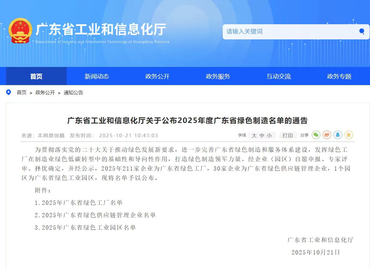 近期,广东省工业和信息化厅公布2025年度广东省绿色制造名单,皇上皇上榜“广东省绿色工厂”名单,这是对其绿色生产实践的权威认可,亦是企业践行绿色可持续发展的重要里程碑。